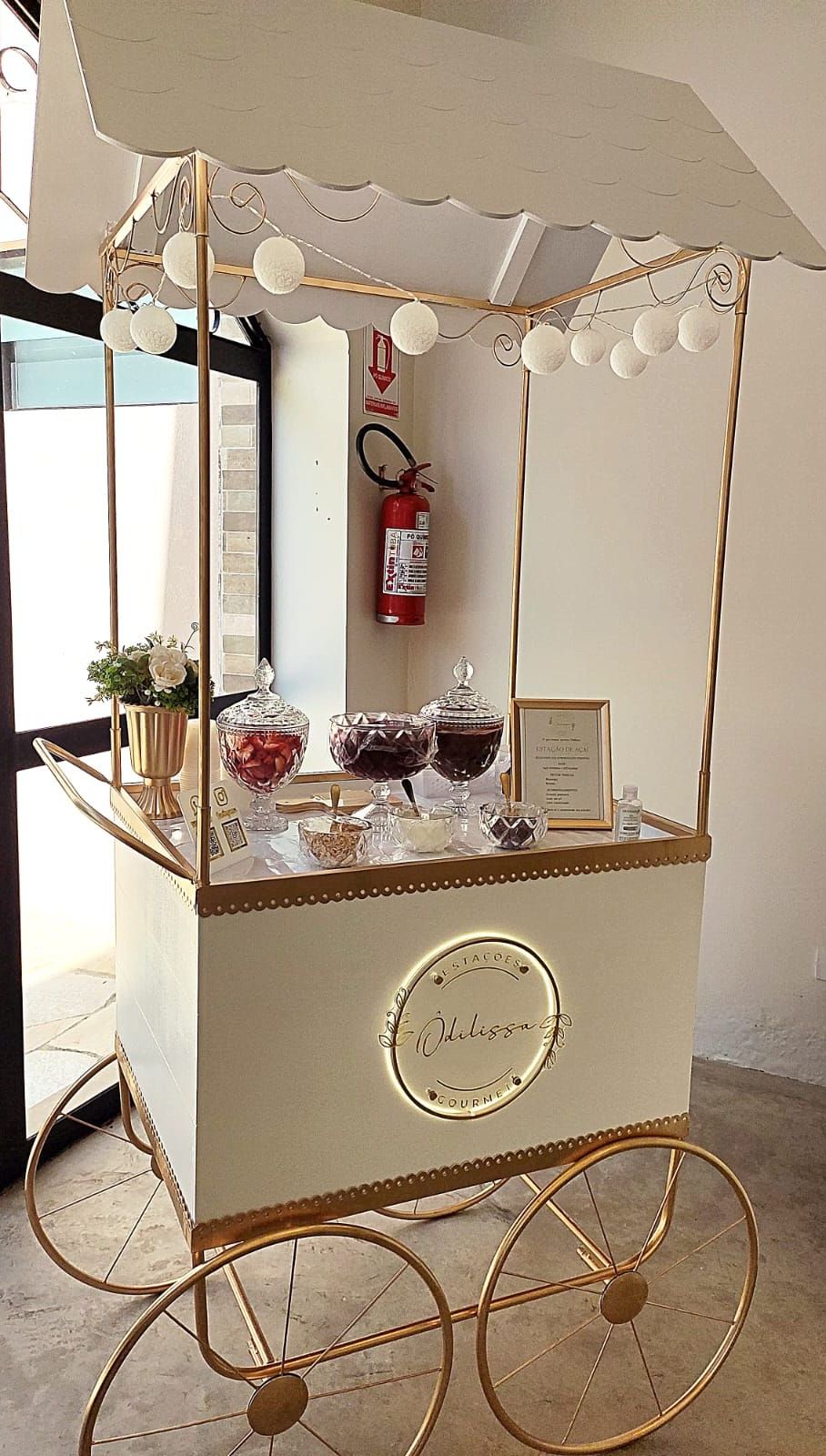 Além disso, temos 3 carrinhos charmosos que levam ainda mais beleza e praticidade para seu evento, adaptando-se ao estilo da sua festa.